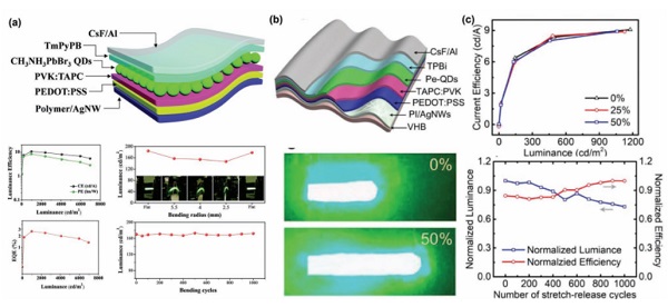 a)基于钙钛矿量子点柔性器件的结构、亮度-效率、EQE-亮度曲线以及在不同弯曲测试下的器件性能