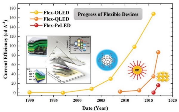 柔性屏具有超薄轻巧、可弯折、低功耗以及高色纯度等特点,具有广阔的应用前景。近年来,产业界对柔性屏的需求不断增长,这不仅是因为其成功实现商业化,更在于柔性屏深深影响了可穿戴设备的形态,大大扩展了其应用范围。柔性有机发光二极管(flex-OLEDs)、柔性量子点发光二极管(flex-QLEDs)和柔性钙钛矿发光二极管(flex-PeLEDs)等显示技术已被广泛报道,其中柔性OLED已经商业化,而后两者要真正实现应用、走进千家万户仍然面临很多挑战。近年来,新型柔性显示技术取得了长足的发展,有必要对其发展进行总结回顾。