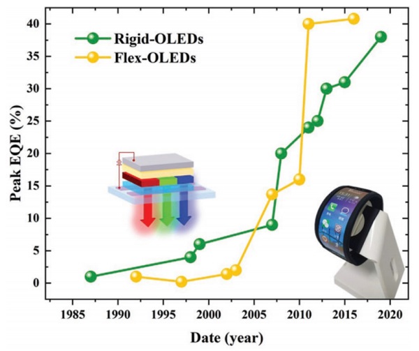 Figure 4.柔性OLED和刚性OLED的效率发展比较