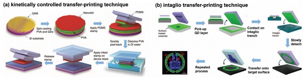Figure 7.干法取放转印技术和凹版转印技术的器件制备过程