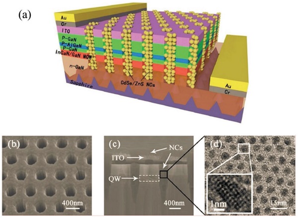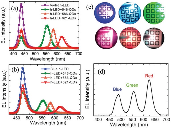 ab)集成了绿/橙/红色QD混合紫/蓝纳米孔LED的EL光谱