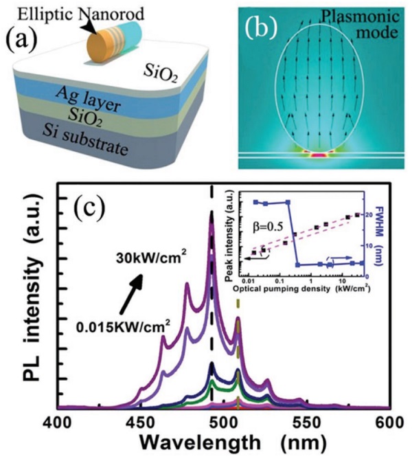 c)在不同的光泵浦功率密度下的PL激射光谱图。
