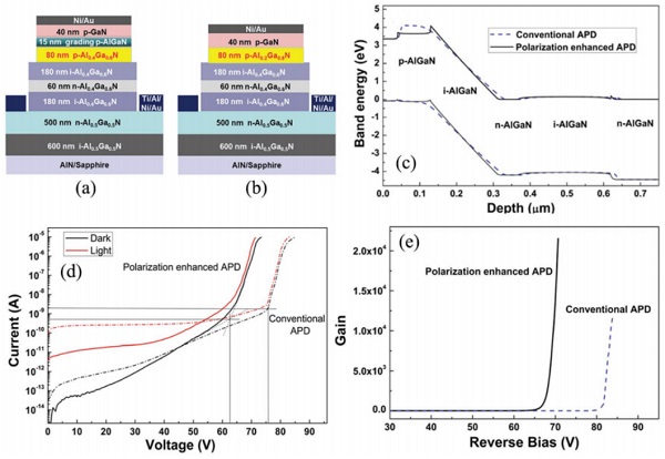 ab)常规结构和极化增强结构的紫外日盲雪崩光电二极管(APD)探测器