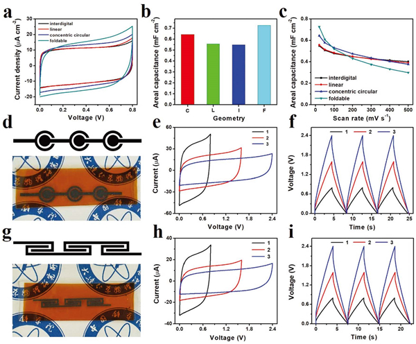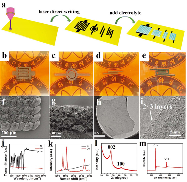近日,中国科学院大连化学物理研究所的吴忠帅(通讯作者)等人采用激光热解聚酰亚胺的方法,一步实现了石墨烯电极材料(LIG)的制备、微型超级电容器(LIG-MSCs)单体的构建和多个微型超级电容器的一体化集成。根据不同的实际应用需求,不仅可以对集成化微型超级电容器的形状和大小进行有效调控,而且能够实现任意数量平面微型超级电容器的串并联集成,有效定制工作电压和电流。由于集成化微型超级电容器的集流体、电极和导电连接体组成相同且一步制得,所得器件具有良好的一体性、柔韧性和性能一致性。此外,在离子液体电解液中该器件表现出出色的高温稳定性,可在100 oC条件下稳定工作。因此,该工作为简单高效制备高度集成化微型超级电容器提供了新的策略,并拓宽了其潜在应用场景。相关成果以“One-Step Scalable Fabrication of Graphene-Integrated Micro-Supercapacitors with Remarkable Flexibility and Exceptional Performance Uniformity”为题发表在Advanced Functional Materials上。