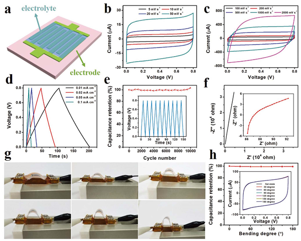 图 2 PVA/H3PO4电解质中,交叉指构型的LIG-MSC的电化学性能和机械柔性