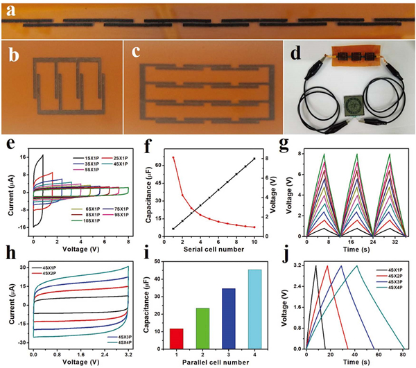 本文采用激光刻写一步实现了从电极材料制备、单个微型超级电容器构建到多个微型超级电容器一体化集成的技术过程,大大简化了集成化微型超级电容器的制作流程,并拓宽了其潜在应用场景,未来有望被用作可穿戴电子、贴片式健康监测器件等多类微电子产品的功率源。