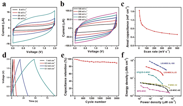 (a,b)5-500 mV s-1下,LIG-MSC的CV曲线;