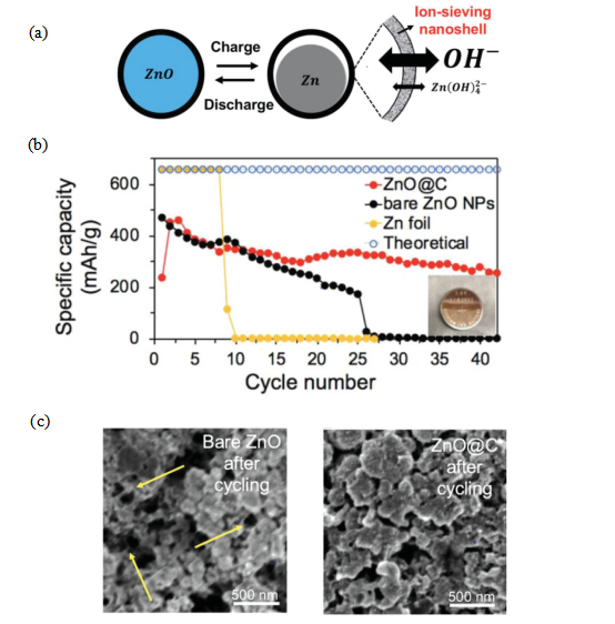 (a)锌金属阳极放电过程中钝化层形成示意图。(b)ZnO的比容量和库仑效率(1.03 mg), ZnO@ c (0.94 mg)。(c)经过三次循环的裸ZnO阳极和ZnO@ c阳极的SEM图像。