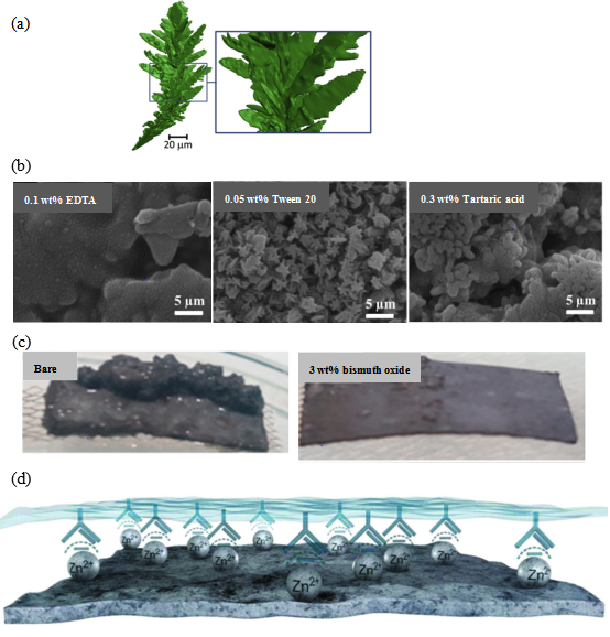 (a)利用纤维-扫描电镜断层扫描得到的单个锌枝晶的三维图像。(b)不同有机添加剂锌电极1000循环后的SEM显微照片。(c)锌阳极经过20循环用于无机添加剂。(d)Zn阳极与PANa电解质之间的准SEI形成示意图。