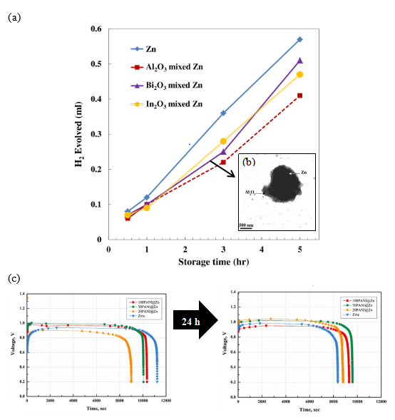 (a)60℃时,锌凝胶阳极表面析出氢气体积测量。(b)涂覆Al2O3的锌粒子的透射电镜图像。(c)PANI@Zn在环境温度下24小时的放电曲线。