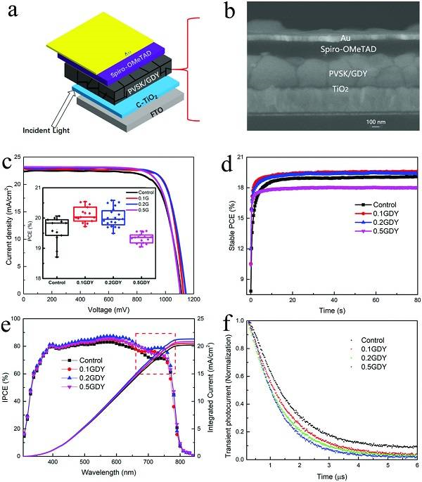 李玉良团队尝试在钙钛矿电池中加入石墨炔以提高其稳定性和效率,通过反溶剂法一步将石墨炔引入FA0.85MA0.15Pb(I0.85Br0.15)3钙钛矿层,构建了石墨炔/钙钛矿(GDY/PVSK)体异质结薄膜。实验证明,钙钛矿/石墨炔体异质结的引入为光生载流子提供了一个额外的传输通道,促进了激子分离并提高光生电子的抽取能力,使得电子传输能力得到了进一步改善,电池获得了更高的短路电流。另一方面,石墨炔的引入钝化了晶界和界面,有效地抑制了光生载流子的复合,获得了相对较高的填充因子。钙钛矿电池的光电转换效率(PCE)达到了20.54%。此外,基于石墨炔/钙钛矿体相异质结的钙钛矿薄膜的耐湿性得到明显改善,器件表现出良好的稳定性。证实了石墨炔与钙钛矿电池的结合后器件性能和稳定性表现出协同提高。