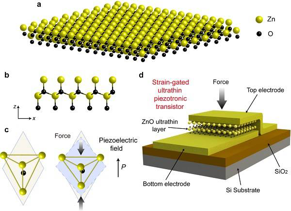 由于短沟道效应,Sub-5 nm硅(Si)场效应晶体管的制造是非常困难的。随着沟道长度的减小,CMOS器件不仅受到小尺寸的制造技术的限制,而且还受到一些基本的物理学原理如漏电场,电介质的击穿等限制。制备了一种新型的、沟道只有2 nm的超薄氧化锌压电电子学晶体管,首次将压电电子学效应引入到二维超薄非层状压电半导体材料中。该工作系统地研究了二维超薄氧化锌垂直方向上的压电特性,利用金属-半导体界面处产生的压电极化电荷(即垂直方向上的压电电势)作为栅极电压有效地调控了该器件的载流子输运特性,并且通过将两个超薄压电电子学晶体管串联实现了简易的压力调控的逻辑电路。这项研究证实了压电极化电荷在超短沟道中“门控”效应的有效性,该器件不需要外部栅电极或任何其它在纳米级长度下具有挑战性的图案化工艺设计。这项研究成果开辟了压电电子学效应在二维非层状压电半导体材料的研究,并且在人机界面、能源收集和纳米机电系统等领域具有潜在的应用前景。