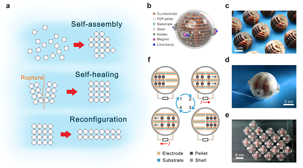 在网络连接方面,设计了一种自适应磁性节点(Self-adaptive magnetic joint, SAM-joint)以实现自组装,该磁性连接节点基于一种可旋转的嵌套磁球结构,实现了磁球的接近-磁极自动旋转配对-吸附的过程,解决了固定磁极吸附存在的吸附错位及磁极不配对等难题,实现了高度可靠的单元组装。为了在保持网络构型的同时实现能量收集,在吸附节点上引入了限位块设计,实现了各向异性的运动自由度约束,使得连接节点在水平面内的运动受到约束,可以保持网络构型,而在竖直平面内可以相对转动,进行波浪能收集。通过对球形TENG单元配置不同的磁性节点数量和位置等几何信息,可以实现不同的自组装网络结构,例如线形结构、空心六边形网格、四边形网格、密排六边形网格等结构形式。通过实验也验证了该网络自我修复破坏以及可重构的能力,因而实现了自组装、自修复、可重构的摩擦纳米发电机网络。这些特征极大地增强了摩擦纳米发电机网络的自治能力和结构可靠性,便于大规模网络的构造和维护,将有可能成为摩擦纳米发电机网络实现实际应用的一个重要基础技术。