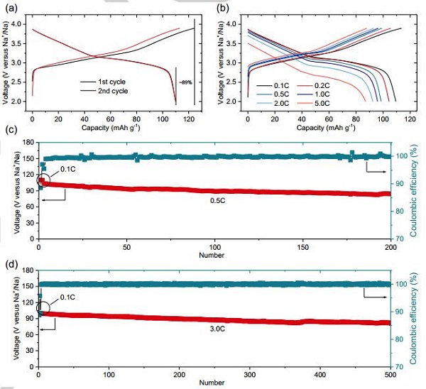 (c-d)在0.5 C和3.0 C的倍率下放电容量和库仑效率保持率。