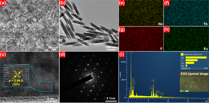 (a)NaTbF4:Eu3+纳米棒的FE-SEM图像;(b) TEM图像;(c)HR-TEM图像;(d)SAED图像;(e-h)组成元素的分布图像;(i)EDX图谱。