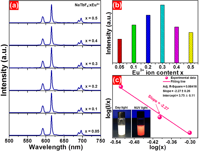 (a)不同Eu3+离子浓度下NaTbF4:Eu3+纳米棒的发光图谱;(b)发光强度与Eu3+离子浓度的关系;(c)浓度淬灭机制的分析图谱。