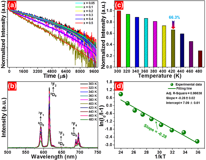 (a)不同Eu3+离子浓度下NaTbF4:Eu3+纳米棒的荧光寿命;(b)不同温度下NaTbF4:Eu3+纳米棒的发光光谱;(c)发光强度与温度之间的关系图;(d)激活能的计算关系图谱。