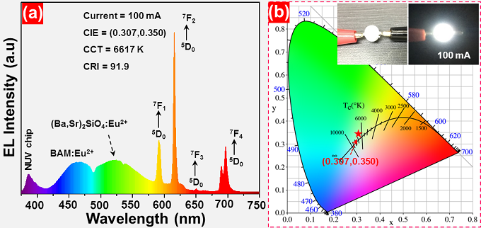 (a)白光LED器件的发光图谱;(b)白光LED器件的CIE色度坐标图。