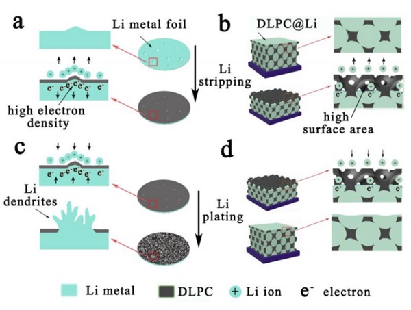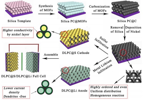 通过构建具有三维有序多孔的光子晶体结构作为电池的主体结构,有效的在微观上确保活性材料、电解质的均匀分布,同时提供高速的电子传输和离子扩散通道,为锂硫电池的固硫和抑制锂枝晶提供了一个积极有效的解决方法。有研究人员曾报道使用镍光子晶体和氢化二氧化钛光子晶体作为Li-S电池的电极结构。但是,由于镍较高的质量密度和二氧化钛较低的导电性,因此我们探索寻求既具有适当的质量密度又具有高电导率的光子晶体。来同时解决Li-S电池的正极固硫和负极抑制锂枝晶问题。