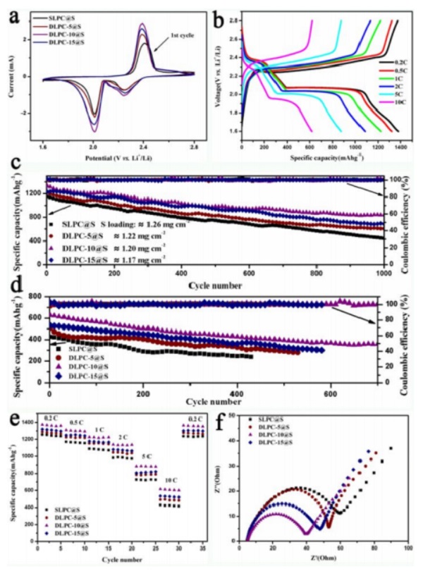 Figure 3.基于电极的总质量,CC@S, NPC @ S, SLPC@S和DLPC@S阴极的倍率特性