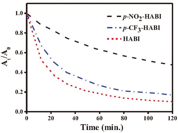 p-NO2-TPIRs的吸光度在359 nm处衰减,p-CF3-TPIRs的吸光度在343 nm处衰减,TPIRs的吸光度在349 nm处衰减。