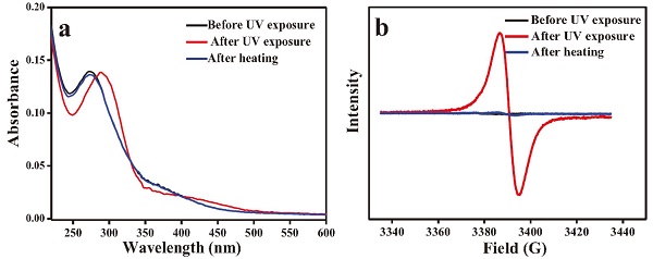 p-NO2-HABI薄膜在UV照,然后在100℃加热20 s前后的UV和ESR光谱。