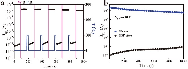 (a-b)PDPP4T/p-NO2-HABI混合薄基膜OFET的存储器设备的WRER循环和保留特性。