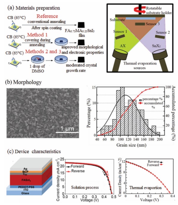a)FA0.75MA0.25SnI3膜的典型溶液沉积涉及DMSO蒸气改性策略,通过DMSO蒸气处理可改善膜质量