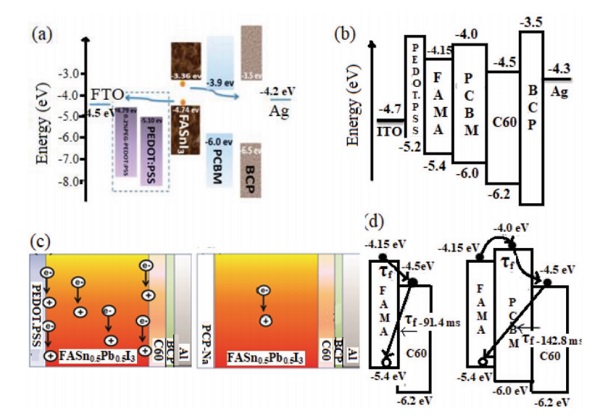 a)通过p型PEG-PEDOT:PSS缓冲层对PEDOT:PSS空穴传输层和FASnI3吸收层之间的能级对准进行调制的器件能级图