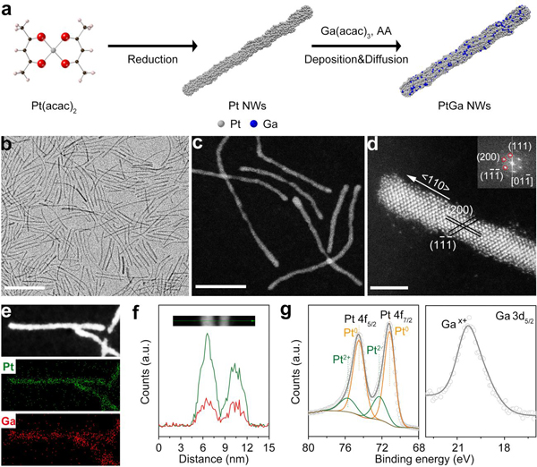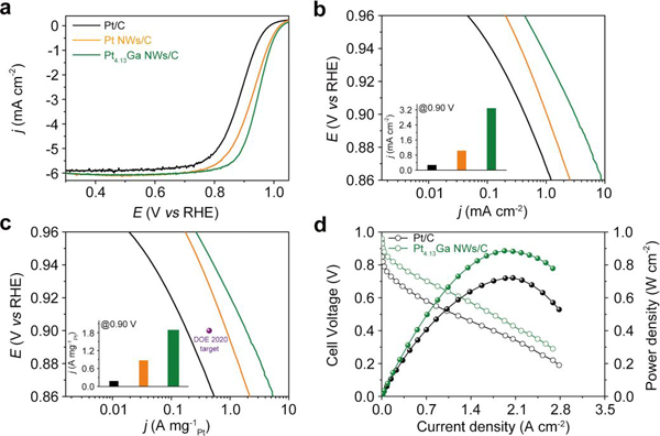 研究者基于具有p-d轨道杂化相互作用的PtGa超细合金纳米线,结合实验证据和理论模拟计算证明了Pt与Ga之间的p-d轨道杂化的强相互作用是其高活性及耐久性的根本原因。这项工作为设计高活性和耐久性的ORR催化剂提供了新的视角。