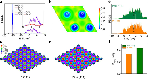 (e)Pt和PtGa合金的表面Pt原子的投影d态密度(PDOS)图。白线表示相应的d带中心。