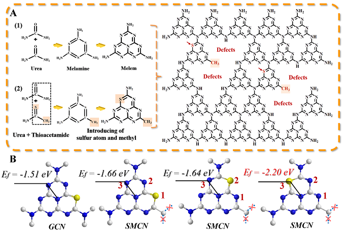 (A)SMCN材料的合成示意图;(B)不同S原子取代位点的生成能