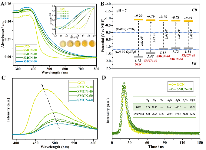 (A)GCN和SMCN的紫外-可见漫反射光谱;(B)GCN和SMCN的能带结构;(C)GCN和SMCN的稳态PL光谱;(D)GCN和SMCN的瞬态PL光谱