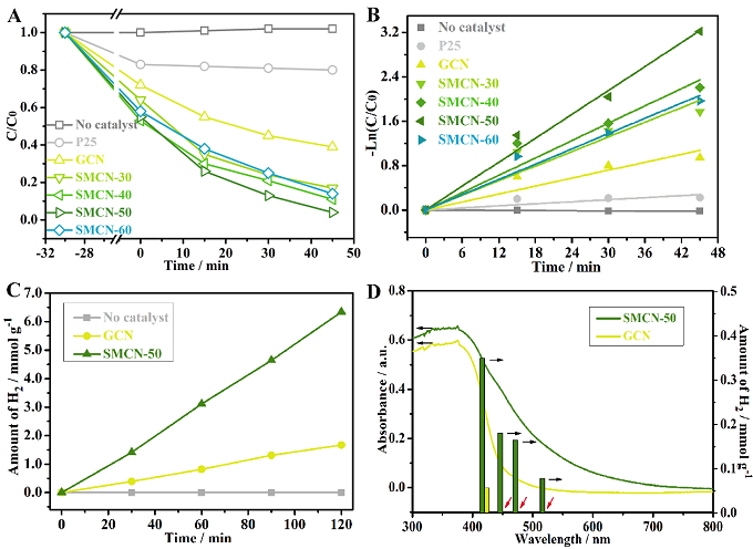 (A)GCN和SMCN的光降解性能测试;(B)GCN和SMCN的光降解动力学分析;(C)GCN和SMCN的产氢性能测试;(D)SMCN在不同波段入射光下的产氢量