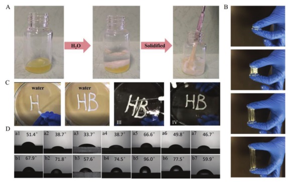 C)显示HBPA在水中附着在玻璃培养皿底部的数码照片(i,ii:HBPA粘性液体用作墨水,并从注射器中推出,在水下绘制“HB”(超支化聚合物的缩写)字母;三:“HB”字用强力水冲洗;四:“HB”字用水冲洗后,仍完好无损,牢固地贴在玻璃上);