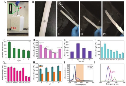 C)聚乙烯板在水中粘贴12小时后,可连续重复五次粘贴试验的粘合强度;D)HBPA在两种不同基材上浸泡36小时后的粘合强度;
