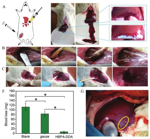 A)大鼠股动脉出血和肝出血模型的建立及注射用HBPA-DDA止血效果示意图。浸染HBPA-DDA的棉签压迫1.5 min(B)和普通棉签压迫2 min(C)治疗大鼠股动脉出血的止血过程。HBPA-DDA(D)对肝损伤出血的止血作用与对照组(未作任何处理(E));放大图(D)显示伤口上形成一层白色HBPA-DDA膜,增强止血作用;放大图(E)显示血液仍在渗出,无任何物理屏蔽。(F)用HBPA-DDA处理SD大鼠肝出血,与纱布组和空白组(未经任何治疗)比较,观察其累积失血量。(G)显示HBPA-DDA对猪肝深部穿刺止血效果的照片(黄色圆圈是猪肝出血点)。*表示显著性(p<0.05,空白:未经任何治疗)。