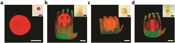 (b)水凝胶手掌的代表性荧光图像,在所需位置含有五种不同的水凝胶;