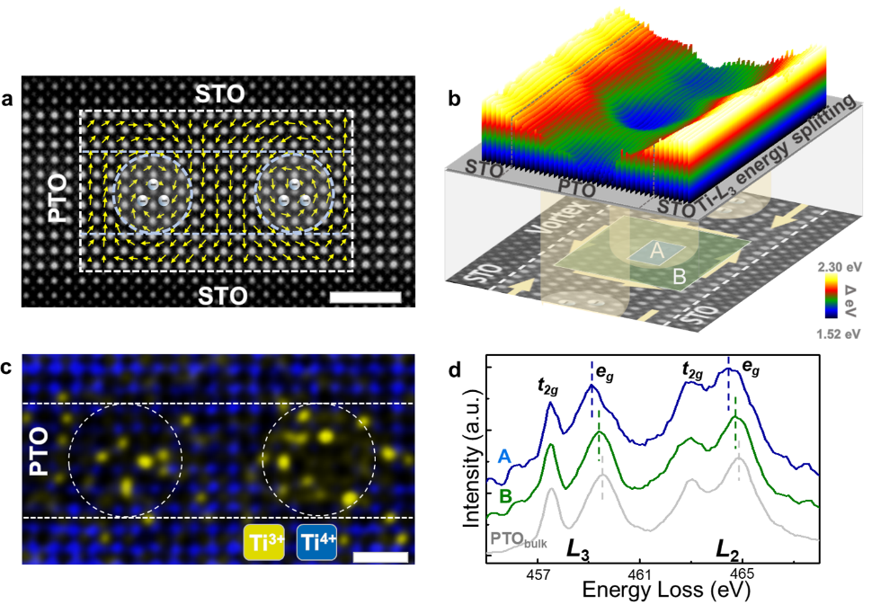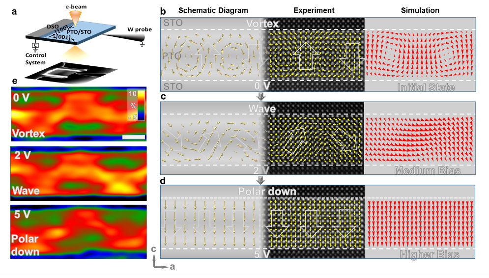 与铁电铁磁相关联的拓扑结构为下一代高密度存储器件重要研究方向之一。在钙钛矿氧化物多铁材料(如PbTiO3/SrTiO3)中,畴结构因其与铁电性、导电性、磁性等诸多丰富物理特性的紧密关联而具有极高研究价值。课题组利用配备能量单色器的球差矫正扫描透射电子显微镜结合原位电学系统,发展了具有高调控自由度的原位实验方法;在原子级别实现了对铁电拓扑结构的有效操控与演变的实时,动态观测;在电子结构层面揭示了拓扑结构的演变特征;从而厘清了在外加电场作用下的拓扑相变规律;为高质量、高性能铁电拓扑结构材料的设计提供了有价值的实验依据。
