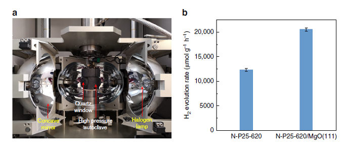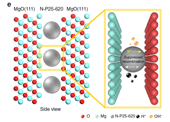 除了材料的稳定性以外,材料的光转换效率也很重要,在最近发表nature communications期刊中,Shik Chi Edman Tsan课题组 [7] 报道了一种现象,在氢离子以及氢氧根浓度增强,以及氧化镁的局域电场存在的情况下,掺N的TiO2的表面可以有效的对电子和空穴对的复合进行抑制。在他们所探究的这种条件下,氢气和氧气以2:1的摩尔比产生,氢气的产率达到11000 μmol/g/h,并且不使用任何的牺牲剂,但是测试温度为270 ℃。并且在437 nm的光照射时,量子效率达到81.8%。