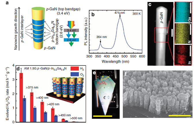 Kibria等人[8]最近研发的全解水光催化剂发表于nature communications杂志上。他们发现通过将p型的掺杂元素掺杂到GaInN纳米线的非极化表面中,可以有效的降低全解水反应中的表面反应势垒。他们在中性溶液中,使用400 – 475 nm波段的光进行照射,获得了~12.3%的量子效率。他们提出了掺杂效应可以改变近表面的能带结构从而调整光催化性质。同时,他们还构建了p型的GaN/InGaN的异质结,得到了~1.8%的光能-氢能转化效率。