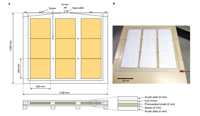SrTiO3:Al器件的合成是将合成的粉末状材料与二氧化硅混合在一起,混合在冷却了的玻璃上。合成的片状器件最开始在实验室中的尺寸为25平方厘米,并且充满深度为1mm的水。在紫外光的照射下,氢气和氧气的产率为5.6 ml cm-2 h-1.在反应的过程中,有氢气和氧气的小气泡逐渐上升,并且不需要外力的驱动。整个装置始终保持着湿润状态。而这个装置值得注意的是,所使用的光催化剂掺Al的SrTiO3以及助催化剂RhCrOx都是成本较低的,可以达到所制定的可接受的标准(US$102 m-2)。假设Rh的价格是US$81 g-1,助催化剂中的Rh是US$0.6 m-2,与标准所比较仅为标准的0.6%。更多的是,总体的催化剂的成本被估算为US$2 m-2。材料的成本是依赖于催化剂的制作成本以及原料成本的。