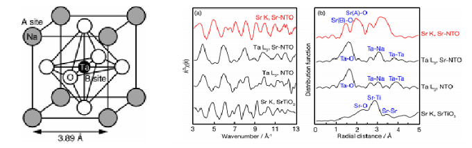 图2 NaTaO3-SrSr1/2Ta2/3O3的原子结构图 (左)和同步辐射结构解析(右)[5]。