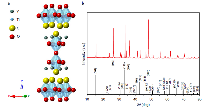 图3 Y2Ti2O5S2材料 [6] 的原子模型图及XRD结构表征 (上);Y2Ti2O5S2材料的扫描,透射以及选取电子衍射表征。(下)