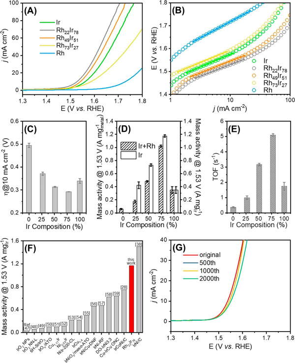 简言之,团队报告了在酸性条件下制备10 nm以下Rh-Ir纳米颗粒作为高效OER催化剂的合成策略。得益于微波辅助合成的优点,RhxIr(100-x) NPs可以在较宽的合成范围内快速简便地制备,得到具有均匀合金结构和可调组成的Rh-Ir纳米粒子。NPs在Vulcan碳上沉积后显示出极好的稳定性,为电化学OER研究提供了理想的模型材料。结合实验和理论研究表明,通过将22%Rh掺入Ir中可以获得O和OOH中间体的较小结合能隙,导致OER性能显著增强,这反映在10 mA cm–2的电流密度时过电位相较纯Ir NPs降低48 mV, 以及质量活性是纯Ir NPs催化剂的3倍。在2000次循环后,没有观察到OER活性的明显降低,这表明碳负载的Rh-Ir合金NPs在酸性电解质中是高度稳定的。本工作为未开发的Rh-Ir合金NPs体系的深入研究提供了基础,也为催化剂组分-电催化性能关系的研究提供了基本理解。