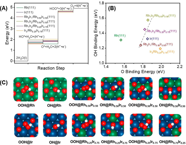 (C)表面上反应吸附物的构型;绿色= Rh,蓝色= Ir,红色= O,白色=H。