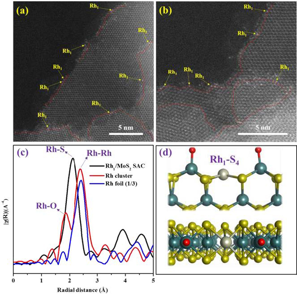 (a)Rh1/MoS2 SAC的代表性原子分辨率HAADF-STEM图像。图中的白点代表单个Rh1原子。为了清楚起见,尽管图像中含有更多的MoS2边缘锚定的Rh1原子,但只有少数几个孤立的Rh1原子用黄色箭头标记。