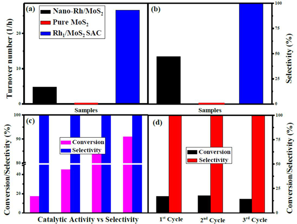 (c)Rh1/MoS2 SAC的转化率和选择性。