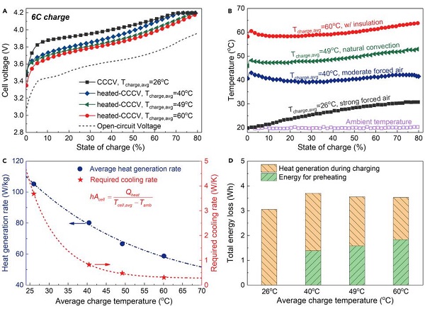 (A-B)在CCCV(6 C,4.2 V)充电过程中,平均充电温度为26℃、40℃、49℃和60℃时(A)电池电压和(B)电池温度的变化;