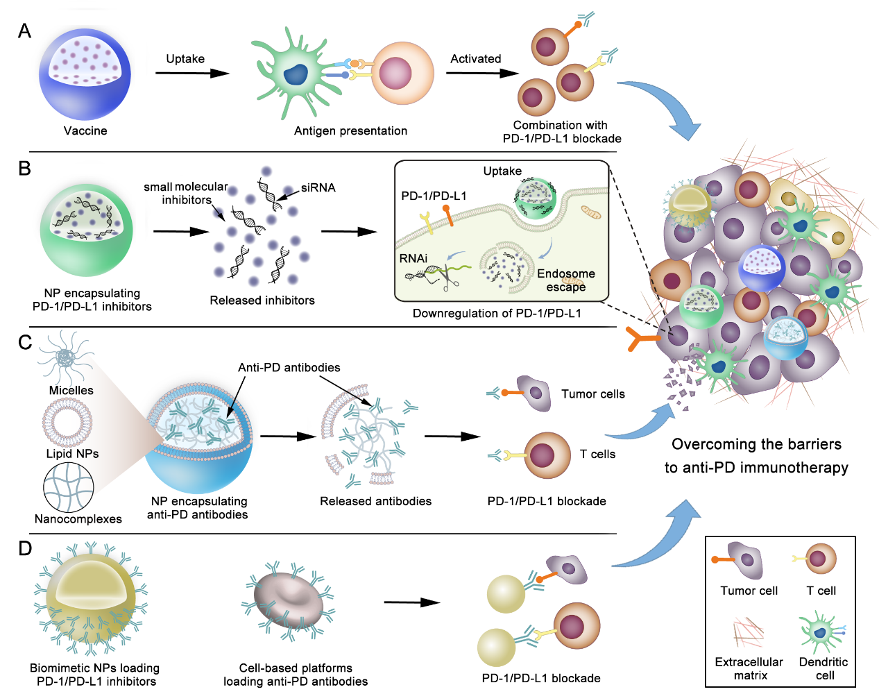 Figure 1. 纳米递药系统通过多种途径克服PD-1/PD-L1免疫检查点阻断抗肿瘤治疗的屏障